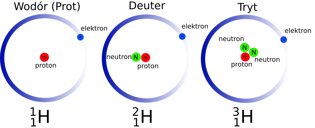 Izotopy to różne formy tego samego pierwiastka chemicznego, które mają taką samą liczbę protonów a różnią się miedzy sobą liczbą neutronów w jądrze atomowym. Istnieje wiele pierwiastków, które mają izotopy stabilne. Najbardziej popularnym i znanym ze szkolnych ław jest wodór (jako prot) i jego stabilny izotop deuter oraz niestabilny i promieniotwórczy tryt. „Zwykły” wodór (1H) czyli prot posiada jeden proton i jeden elektron, nie ma neutronów w jądrze. Deuter (2H) ma po jednym protonie i neutronie oraz jeden elektron. Tryt (3H) ma dwa neutrony, jeden proton oraz jeden elektron i w czasie około 12,32 lat rozpada się na hel.