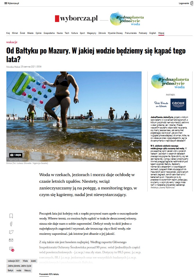 Zrzut ekranu ogólnodostępnego tekstu artykułu Gazety Wyborczej zatytułowanego „Od Bałtyku po Mazury. W jakiej wodzie będziemy się kąpać tego lata?” Artykuł autorstwa Pani Moniki Waluś, zdjęcie we wstępie artykułu Pan Łukasz Głowala