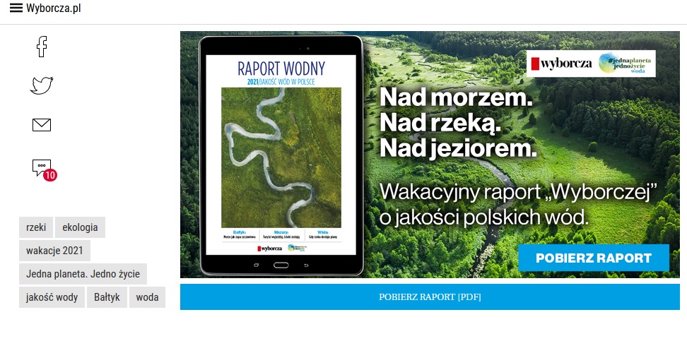 Zrzut ekranu odnośnika do pobrania Raportu Wodnego Gazety Wyborczej dostępnego dla osób z prenumeratą Dostęp 05.08.2021. Źródło: Gazeta Wyborcza załącznik do artykułu: Bałtyk jest taki jak rzeki, które do niego wpadają. Raport wodny „Wyborczej” autor Monika Waluś publikacja artykułu: 29 czerwca 2021, 05:38.